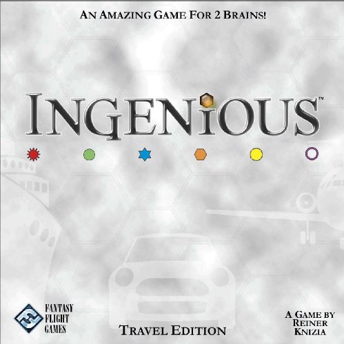 That's ingenious! The award-winning abstract tile-placement game from internationally-renowned game designer Reiner Knizia is back in a brand new travel-sized edition. Players place colored tiles on the hexagonal board, scoring points, blocking opponents' tile placement, and trying to protect themselves from being blocked by their opponents. Marvelously elegant, and compulsively replayable, Ingenious now fits on a portable two-player board, with convenient scoring pegs and slots for tiles! It's a delightfully clever rendition of the popular board game that's simply ... Ingenious!